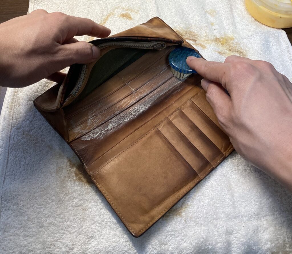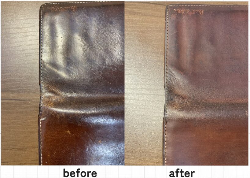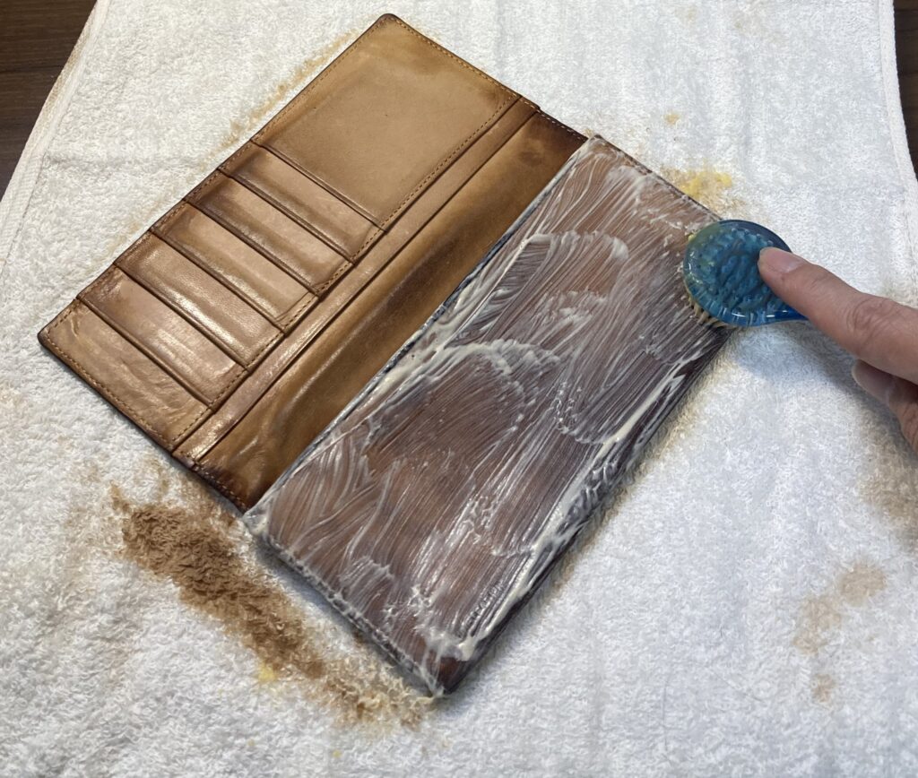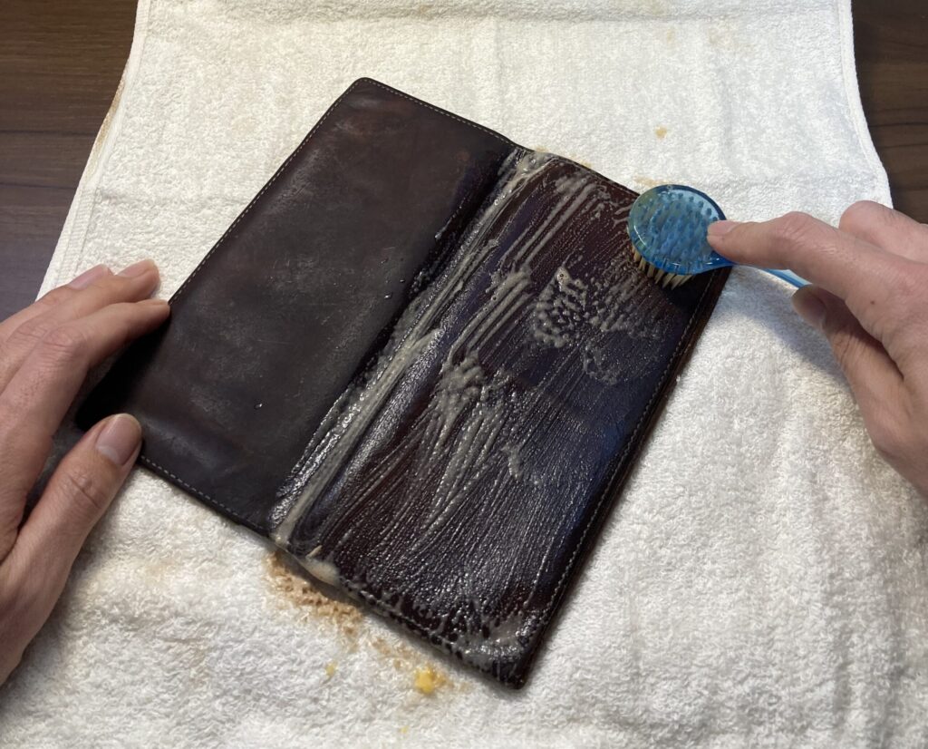 今回は表革の汚れが凄いので2回汚れ落としの工程を行いました。